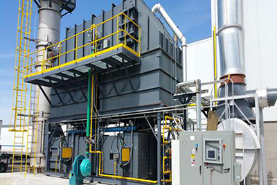 经过过滤系统处理的废气通过收集管道,进入蓄热室,蓄热室内安装的板片式陶瓷蓄热体将贮存的热量交换给废气,使待处理废气达到预热温度;经预热后的废气进入氧化室,氧化室内安装燃料燃烧器,将温度升高至800℃以上,达到废气中各污染物的氧化温度,使废气中的废气被氧化成CO2和H2O;