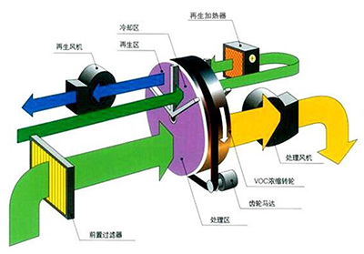 在处理区VOCs被吸附剂吸附去除,净化后的空气从浓缩转轮的处理区排出。吸附在浓缩转轮中的有废气VOCs,在脱附区经热风处理而被脱附、浓缩到5-20倍的程度。浓缩转轮在脱附区被脱附 经过脱附区的空气,加热后作为空气使用,达到净化节能的效果。